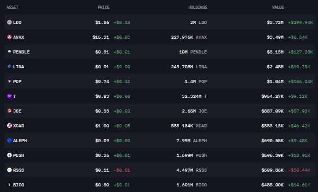 Mainly holding $LDO $4m, $AVAX ($3.4m), $PENDLE, $LINA, $POP