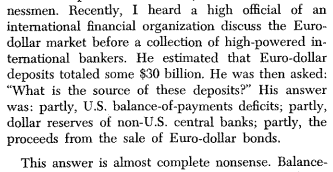 But I don't feel people are that much more clear about the role and significance of eurodollars than they were in 1971, when Milton Friedman wrote this highly readable paper on the nascent market: