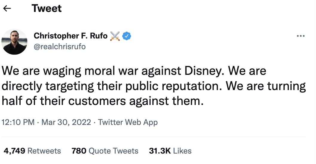 Right now, when it matters most of all, they will stand for those values with every fiber of their being. Yeah guys like Rufo can try, but Disney is so much bigger, means so much more to the American people than that little punk can ever hope to mean. END//