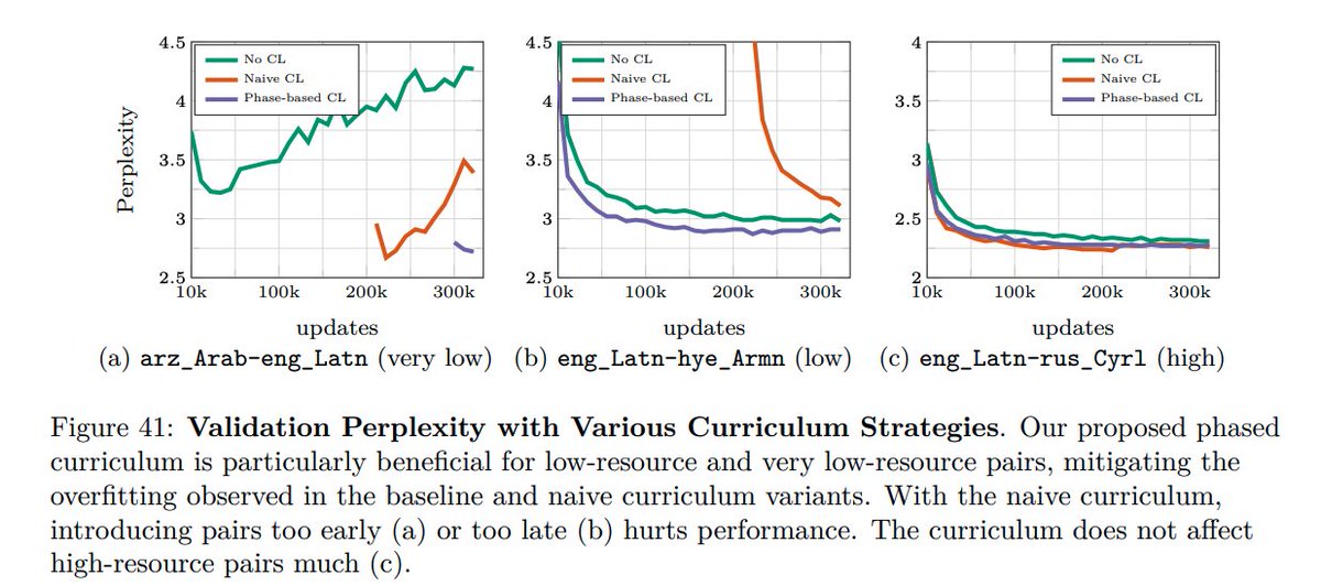 (13/n) We tackle overfitting further with curriculum learning, a phased curriculum, that buckets language pairs based on when they overfit during a no-curriculum training.