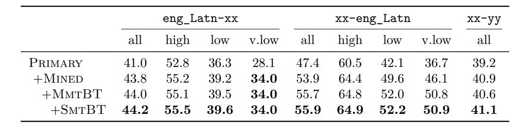 (15/n) Backtranslation from multiple sources helps. We add backtranslated data from Statistical MT models in addition to NMT models to boost performance. Fine-grained tagging of different data sources is beneficial.