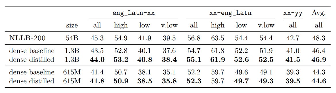 (19/n) Distilled NLLB models are powering real world use cases like helping @Wikimedia editors for content translations. Online distillation of NLLB-200 gives us models much smaller in size but just slightly reduced performance.