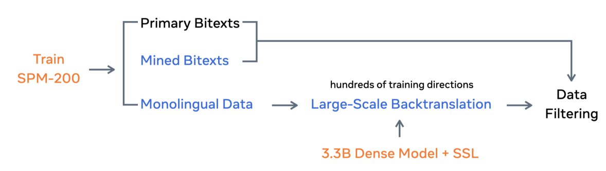 (8/n) Data filtering and cleaning is a super important step which effects the final MT quality. A clean monolingual corpora powers and improves several of the subsequent steps in the NLLB pipeline - mining, backtranslation and self-supervised learning.