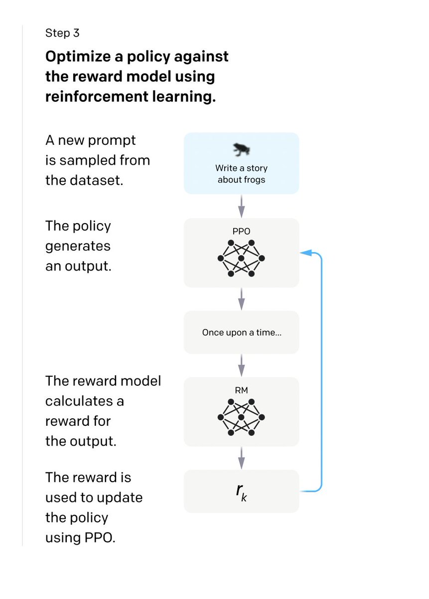 The final step is to use this RM as a reward function and fine-tune the SFT model to maximize the reward using Proximal Policy Optimization which is Reinforcement Learning Algorithm