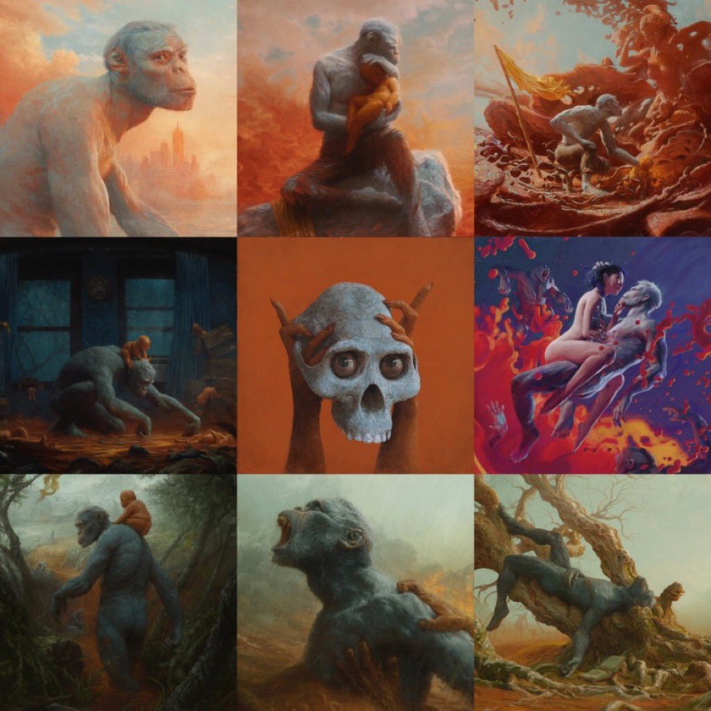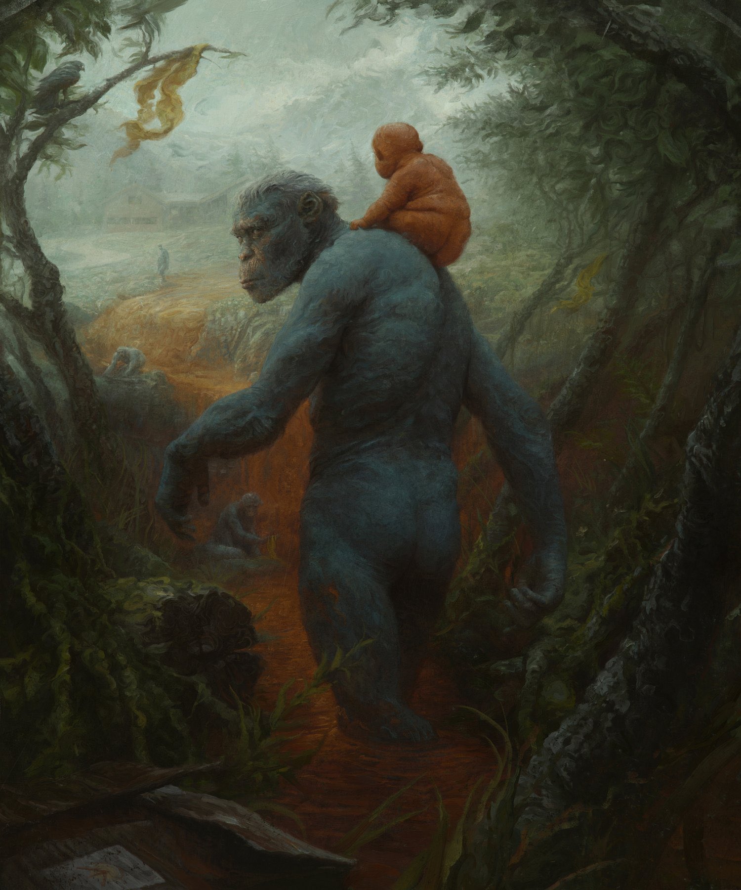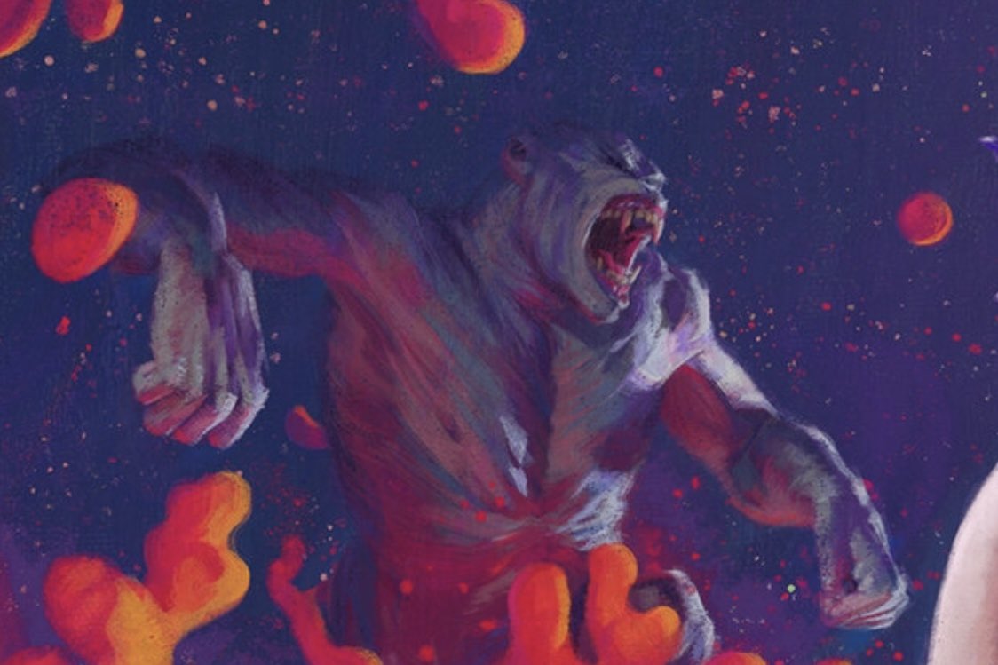 7/ From the colorful blobs and space dust, two apes lunge at Luci and the female figure.