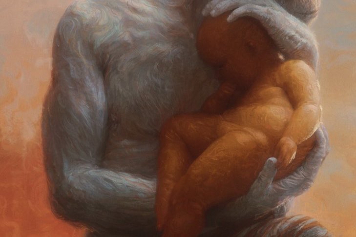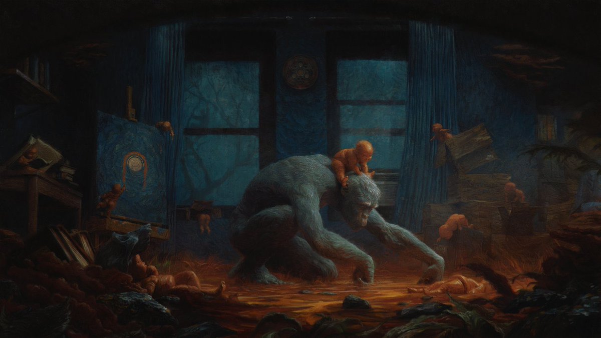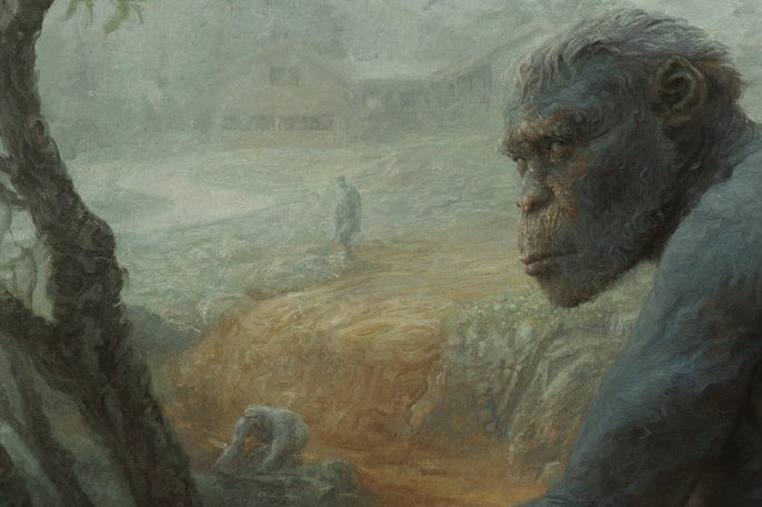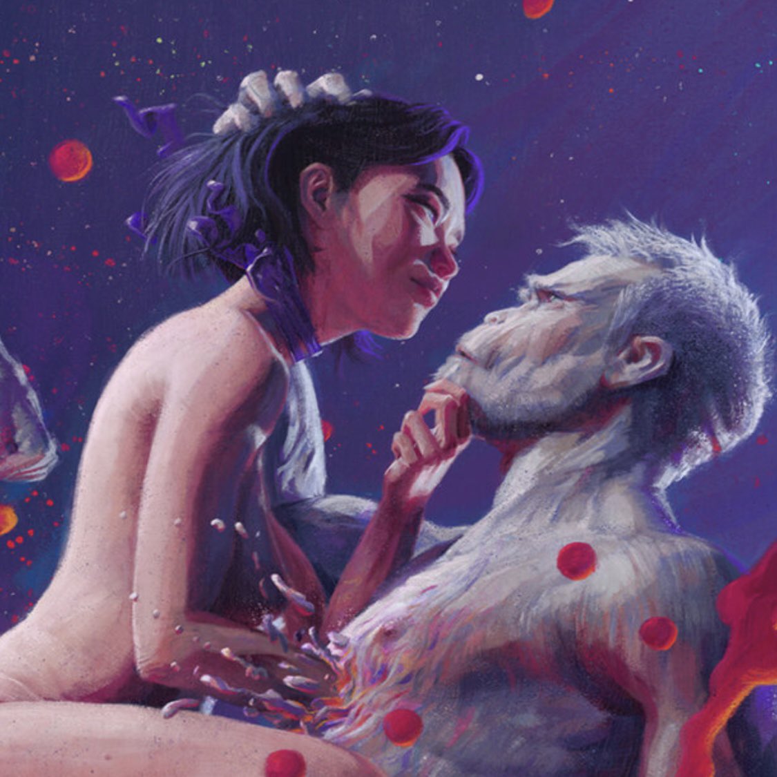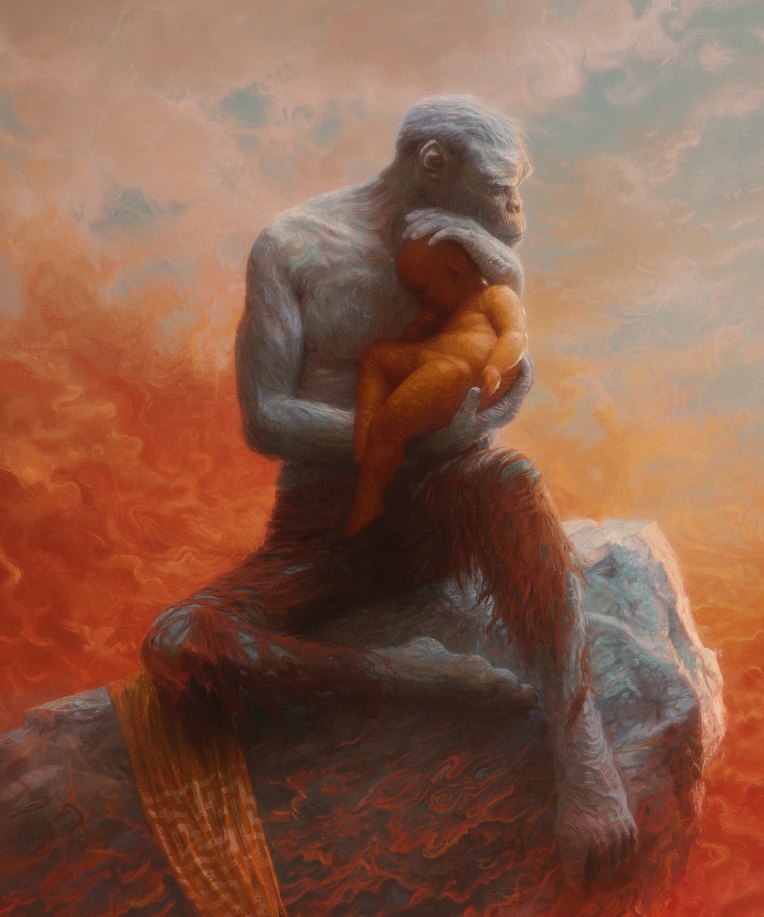 7/ From the colorful blobs and space dust, two apes lunge at Luci and the female figure.