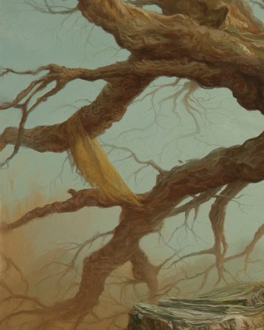 In “Map to Wander” the yellow fabric is seen hanging from a tree branch beside a watching bird.
