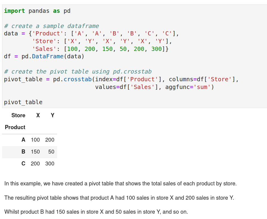 This function creates pivot tables: ๐ฉ๐.๐๐ซ๐จ๐ฌ๐ฌ๐ญ๐๐ allows you to easily generate cross-tabulation tables, which are essentially pivot tables, without having to manually reshape the data.