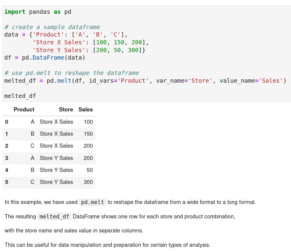 Using for reshaping data; ๐ฉ๐.๐ฆ๐๐ฅ๐ญ allows you to transform a DataFrame from a wide format to a long format, or vice versa.