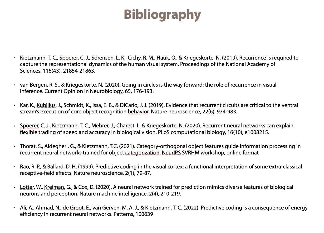 Lecture 8, recurrence. We talked about ventral stream dynamics, temporal unrolling and BPTT, and predictive coding. I included some of our own work (Spoerer et al., @martisamuser, @hellothere_ali), and great work by @KohitijKar. bg reading by @rubenvanbergen /9