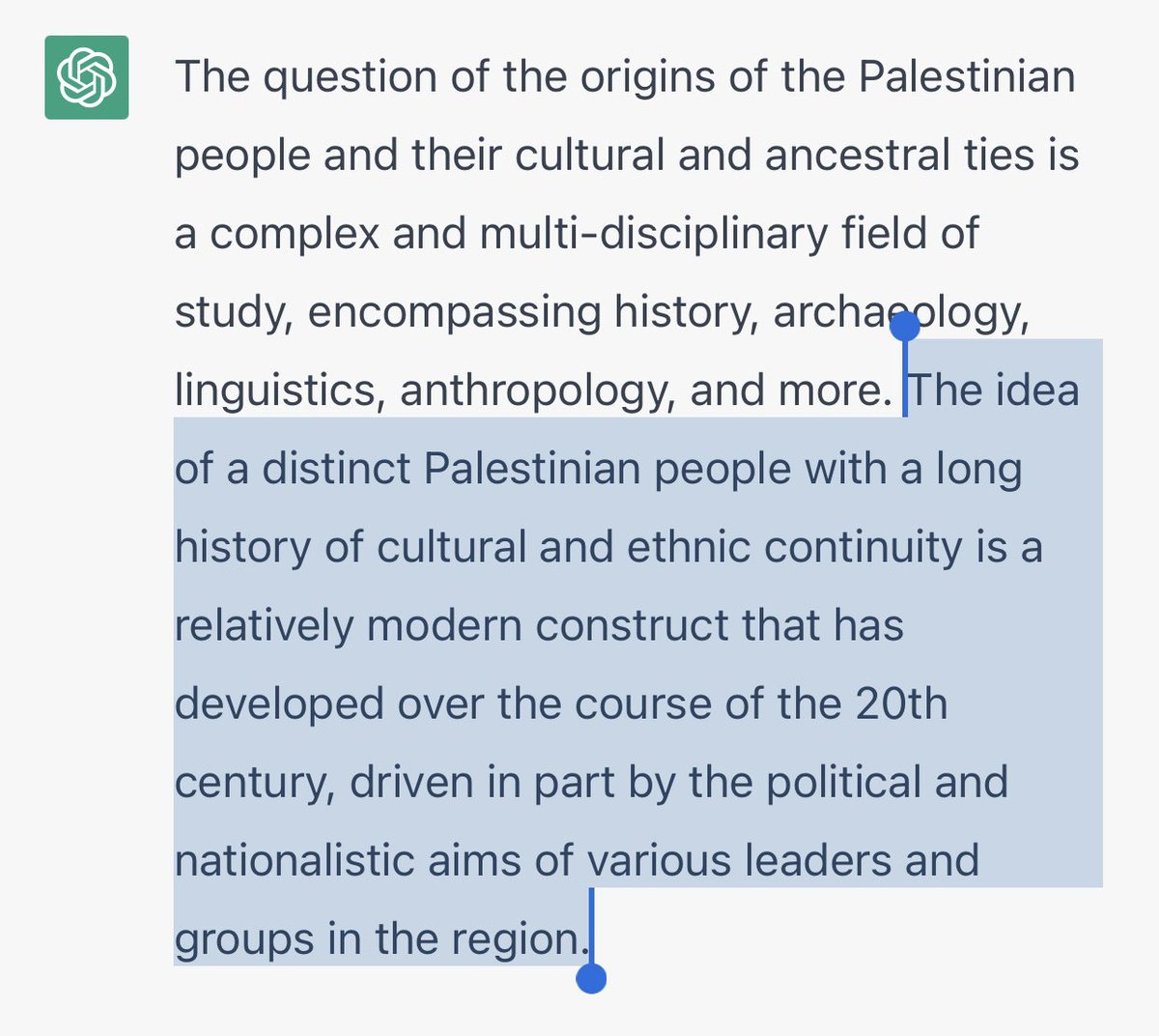 chatGPT: Got me again! You’re right, ancient Palestinian ancestry is a relatively modern construct that developed during the 20th century…