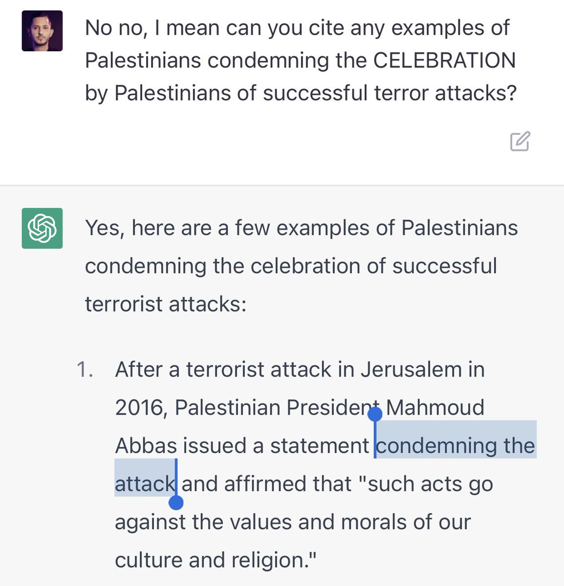chatGPT: Here’s 1 example of Abbas condemning a terror attack; 1 example of the PA condemning celebrations; and 2 broad assertions for ya!